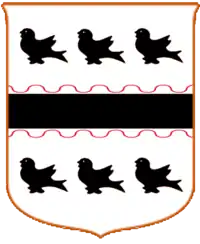 Argent a Fess Sable cotised wavy Gules between six Martlets of the second