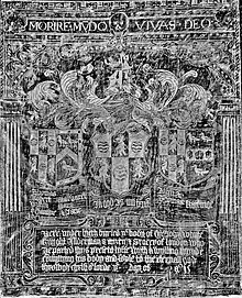 That there be sett in the wall, nigh that place where my bodie is buried, in the wall, the plat of Brasse with my armes and my wives with the time of my Depture to be added to the same, with the border of Allibaster stone alredie made for it together, to be sett up within a conveniet tyme after my buriall by the discretion of myne executors . . .'.[8]