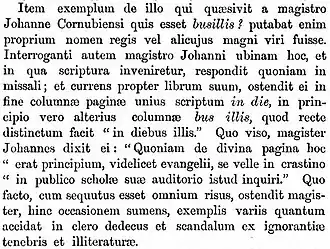 Another example (of the illatinity of contemporary clergy) is the scholar who asked his master John of Cornwall: Who was Busillis? He thought it was the name of a king or another great man. When John asked him in which book he had found the expression, the scholar answered: in the missal. And fetching the book, he showed his master at the end of one column the words in die and at the beginning of the next the word busillis - which, correctly grouped, makes in diebus illis. Master John, seeing that, said to him: "Considering that the word originates from a holy page, that is from the gospel, I will inquire it tomorrow with the audience in my public lesson." The master did so, and answered by the laughter of all, he took the occasion to show by more examples what shame and scandal was brought over the clergy by their dark ignorance and illiterateness.