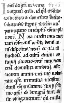 The opening of John's Descriptio from the Tegernsee manuscript. It begins Johannes, Dei gratia in wirziburgensi ecclesia, id quod est, dilecto suo socio et domestico Dietrico salutem et supernae Jerusalem... ("John, who by the grace of God is that which he is in the church of Würzburg, wishes health and a sight of the heavenly Jerusalem to his beloved friend and follower Dietrich...")[1]