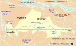 Johnson Creek begins near the unincorporated community of Cottrell in Clackamas County, Oregon, southeast of Gresham in the foothills of the Cascade Range, and flows generally westward about 25 miles (40 km) to its confluence with the Willamette River, a major tributary of the Columbia River.[2][5][6] The creek passes through the cities of Gresham, Portland, and Milwaukie and crosses the border between Clackamas County and Multnomah County eight times.[5][6]
