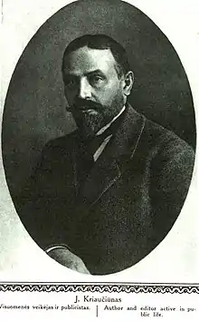 After the Lithuanian press ban was lifted in May 1904, Petras Vileišis offered him a job publishing the first Lithuanian daily Vilniaus žinios.[1] Kriaučiūnas joined the editorial staff but quickly quarreled with Povilas Višinskis who accused him of chauvinism and anti-Semitism. Vileišis supported Kriaučiūnas and Višinskis resigned in early 1905.[9] Kriaučiūnas sometimes was blamed for the conservative stance of Vilniaus žinios (e.g. in writings of Felicija Bortkevičienė). He resigned from the newspaper in January 1906.[9]