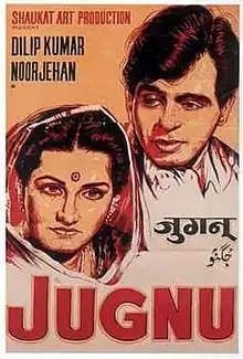 Jugnu (transl.Firefly) is a 1947 Indian musical romantic comedy film directed and produced by Shaukat Hussain Rizvi. The film stars Dilip Kumar and Noor Jehan in lead roles with Ghulam Mohammad, Jillo, Latika, and Shashikala in supporting roles. It also features a cameo appearance by Mohammed Rafi.[1] It revolves around Suraj, the son of a rich landlord, and Jugnu, an orphan, who fall in love with each other.[2]