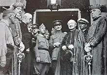 In mid-June Queipo, who as the Carabineros inspector enjoyed freedom to travel across the country, visited numerous garrisons in Andalusia.[13] He was welcomed rather coldly by local conspirators, who considered him politically capricious and extravagant, stained by earlier republican sympathies and masonic links. He also met Villa-Abrille. Details of their talks are not clear, it is possible if not likely that Queipo at least hinted to the former about a possibility to join a "patriotic action", but there is no information of the military governor joining the plotters; some scholars claim that Villa-Abrille declined the offer.[14] However, his initiative was to assemble corps commanders and visit Varela; the officers were asked one by one to swear loyalty to the Republic.[15] At the time some conspiring officers were already providing regular training to Falange militants, while Carlist requeté geared up in the countryside.[16]