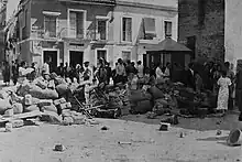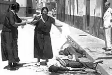 In the afternoon hours the rebel command started to deploy military detachments in key strategic points of access to the city centre; the intention was to prevent a would-be advance of left-wing militias.[54] Indeed, increasingly militant crowd started to gather around local Casas del Pueblo and Guardia de Assalto stations in popular districts of Macarena (in the north) and Triana (in the south, across the Guadalquivir); party and trade union leaders demanded weapons. When denied arms, some decided to seize them. Few thousand people besieged the artillery depot at Paseo de Colón; the military repulsed the attack with fire, leaving some 15 people dead.[55] Unable either to reach the centre or to seize weapons, the crowd turned to looting, arson and terror. Popular quarters were dominated by chaotic violence; the mob commenced hunt for individuals deemed enemies of the people, and some 15 churches were set on fire.[56] Trade unions declared general strike.[57]