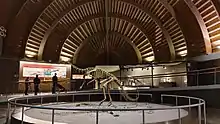 The first floor, ground floor and basement of the building are 5,000 square metres (54,000 sq ft). Three wide vaults or rooms extend to the ceiling and are divided by the Mesozoic divisions of Cretaceous, Jurassic, and Triassic. The basement houses over 400 tons of fossils that have yet to be classified. The first floor has a temporary exhibition room, a reception room, administration room, and workshops, as well as a library and a laboratory. The ground floor contains a display hall, an audio-visual room and the permanent exposition room, along with an auditorium. The service areas include a store, gardens, cafeteria, and playgrounds.[10]
