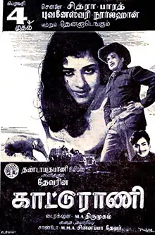 Kaattu Rani (transl.The queen of the jungle) is a 1965 Indian Tamil-language film produced by Sandow M. M. A. Chinnappa Thevar via Dhandayuthapani Films and directed by M. A. Thirumugam. The film stars S. A. Ashokan, K. Balaji, K. R. Vijaya and Sheela. It was released on 4 February 1965.