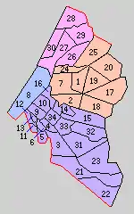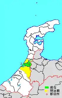 * yellow - areas formerly within the district borders during the early Meiji period