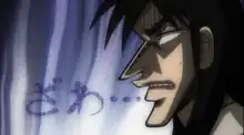 Kaiji, and most of Fukumoto's other works as well, are drawn in a "cartoonish and loose" style. Fukumoto uses techniques like shake up the character's eyeballs and face to express their feelings. The titular character is drawn "sharper": he has an angular face, pointy chin and sharp nose, making it difficult to freehand draw him. Fukumoto uses a ruler and rotates the manuscript paper to draw him.[13][11] For the antagonists, Fukumoto depicts their "ugliness" by bringing up a scary look in their eye and "threatening teeth."[11] Fukumoto uses his trademark onomatopoeia, "zawa..." (ざわ…), to express the characters' uneasiness.[14][11][13] He also uses visual metaphors, like making Kaiji jump a large crevice or drawing him into a rushing torrent of water, to express the uneasy atmosphere.[11][15] Women rarely appear in the series,[14] with Mikoko Sakazaki being the most prominent one, and their appearance in gambling scenes are even rarer, as Fukumoto reportedly stated that women are unnecessary in the gambling world;[13] nevertheless, in July 2019, Fukumoto started Yami-ma no Mamiya, a gambling mahjong manga series which features a female character as protagonist.[16]