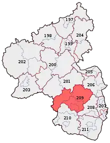 Kaiserslautern is an electoral constituency (German: Wahlkreis) represented in the Bundestag. It elects one member via first-past-the-post voting. Under the current constituency numbering system, it is designated as constituency 209. It is located in southern Rhineland-Palatinate, comprising the city of Kaiserslautern, the Donnersbergkreis district, the Kusel district, and the northeastern part of the Landkreis Kaiserslautern district.[1]