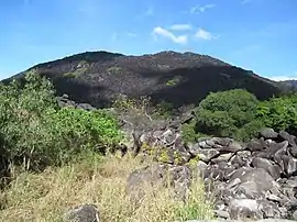 The softer land surfaces above the solidified magma eroded away over time, leaving the magma's fractured top to be exposed as a mountain of grey granite boulders blackened by a film of microscopic blue-green algae growing on the exposed surfaces. Colder rains falling on the dark, heated granite boulders causes the boulders to progressively fracture, break, and slowly disintegrate, sometimes explosively.[5]