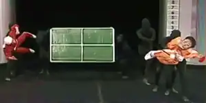 Screenshot of the Matrix Ping Pong skit from Kasou Taishou showing the use of black-dressed stagehands for special effects