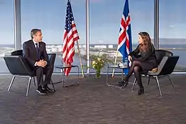 Katrín opposes Icelandic membership of NATO, but as part of the compromise between the Left-Greens and their coalition partners, the government does not intend to withdraw from NATO or hold a referendum on NATO membership.[16] Katrín also opposes Iceland joining the European Union (EU).[17][18] The coalition government does not intend to hold a referendum on restarting Iceland's accession negotiations with the EU.[17][18]