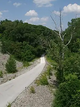 The Katy Trail State Park is a state park in the U.S. state of Missouri that contains the Katy Trail, the country's longest continuous recreational rail trail.[1] It runs 240 miles (390 km), largely along the northern bank of the Missouri River, in the right-of-way of the former Missouri–Kansas–Texas Railroad.[2] Open year-round from sunrise to sunset, it serves hikers, joggers, and cyclists. Its hard, flat surface is of "limestone pug" (crushed limestone).