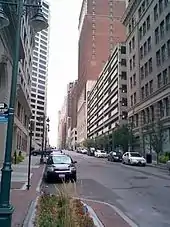 The city's tallest buildings and characteristic skyline are roughly contained inside the downtown freeway loop (shaded in red). Downtown Kansas City itself is established by city ordinance to stretch from the Missouri River south to 31st Street (beyond the bottom of this map), and from State Line Rd. to Troost Ave.