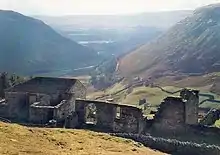 The ruins of Crackpot Hall lie about a mile east of Keld on the northern slope of the dale at grid reference NY906008. There may have been a building on this site since the 16th century[3] when a hunting lodge was maintained for Thomas, the first Baron Wharton, who visited the Dale occasionally to shoot the red deer. Survey work by the Yorkshire Dales National Park Authority has shown that the building has changed many times over the years. At one time it even had a heather or "ling" thatched roof.