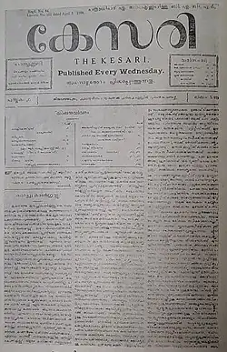 Kesari was an Indian weekly newspaper in Malayalam, published from Trivandrum under the editorship and ownership of A. Balakrishna Pillai, who later came to be known by the name Kesari Balakrishna Pillai. Pillai started the newspaper in 1930, a week after the license of his independent weekly Prabodhakan was revoked by the government per the Travancore Newspaper Regulations Act of 1926. Pillai was imposed a fine of Rs. 200 for contempt of court. Pillai obtained a new newspaper licence from Narayana Pillai who was running a weekly named Kesari at the time. Kesari effectively replaced Prabhodhakan and Pillai continued his fight against the government and corruption in the system through Kesari. It was printed at Sharada Press which Pillai had established in 1926. Pillai continued the publication of Kesari till 1935 when the Newspaper Act was modified and the transfer of press licenses was prohibited. According to the new law, the license fee was increased to Rs. 1,000. Pillai travelled to places like Malaysia and Singapore to collect funds but collecting money was seen as unethical so he did not go ahead with it. The newspaper was discontinued due to mounting debts in April 1935; Pillai had to sell Sharada Press to pay off the debts. Balakrishna Pillai's editorials for Kesari were popular. He strongly criticised the government through his editorials and also dealt with literary subjects. His articles in Kesari have been compiled and published as a book.[1][2][3]
