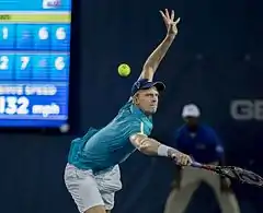 Kevin Michael Anderson (born 18 May 1986) is a South African professional tennis player. He achieved his career-high Association of Tennis Professionals (ATP) ranking of world No. 5 on 16 July 2018.[2] He was the first South African to be ranked in the top 5 since Kevin Curren was No. 5 on 23 September 1985.On 6 February 2011, Anderson defeated Somdev Devvarman in his hometown of Johannesburg to capture the South African Open title for his first ATP Tour-level title. His second ATP title came at the 2012 Delray Beach Open when he defeated Marinko Matosevic. Anderson won his third championship in 2015 at the Winston-Salem Open with a victory over Pierre-Hugues Herbert. He ended 2017 winning the exhibition World Tennis Championship. His fourth title came in February 2018 at the New York Open. Anderson reached his maiden Grand Slam final at the 2017 US Open, where he lost to Rafael Nadal.[3] In the 2018 Wimbledon semifinals, Anderson reached his second major final by defeating American John Isner in the second-longest match in the history of major tournaments. The match, which lasted 6 hours and 36 minutes, was only beaten in length by the 2010 match between Isner and France's Nicolas Mahut. He then lost to Novak Djokovic in the final in straight sets. On 3 May 2022, Anderson retired at age 35[4] but he announced his comeback in July 2023.