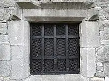 A four-storey tower house with some original mullioned windows. It is vaulted above the ground floor and the front and back walls were removed so that the castle is pierced by a large Gothic arch.[10]