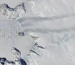 ![]() Natural-colour image showing the heavily crevassed terminus of the King Oscar Glacier. | |