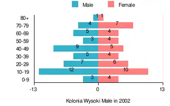 According to the 2002 Poland census, there were 94 people residing in Kolonia Wysoki Małe village, of whom 52.1% were male and 47.9% were female. In the village, the population was spread out, with 28.7% under the age of 18, 31.9% from 18 to 44, 18.1% from 45 to 64, and 21.3% who were 65 years of age or older.[1]