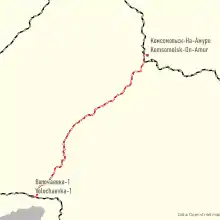 The Komsomolsk–Dezhnyovka railway line (Russian: Комсомольск-на-Амуре — Дежнёвка) is about 363 km of Far Eastern Railway within Russian Railways.[1] It connects Dezhnyovka station of Trans-Siberian Railway near Khabarovsk and Komsomolsk-on-Amur station of Baikal-Amur Mainline. The construction of this line began in 1935, and opened in 1940.[2]