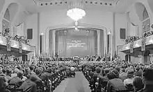 It is often claimed that the building served as a military hospital during the First World War - however, this cannot be proven and is considered rather unlikely.[1] After the war, the house was once again a social meeting place in Leipzig. There was only minor damage during the Second World War, which was soon repaired. In 1947, the Congress Hall was reconstructed and rebuilt (widening of the tiers, lower ceiling, installation of a stage). It thus became the most important social hall in the city of Leipzig.[4]