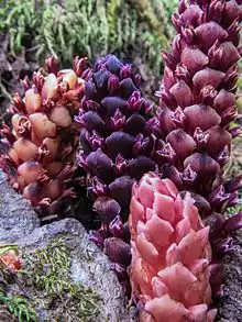 It is a parasite of salal bushes, which it parasitizes by penetrating them with haustoria to tap nutrients. The groundcone is visible aboveground as a purplish, brown, or yellowish cone-shaped inflorescence 3 to 6 cm (1.2 to 2.4 in) long. Pale-colored flowers emerge from between the overlapping bracts. Coastal aboriginal groups ate the potato-like stembase of Ground Cones raw, though usually as a snack and not in any quantity.[6]