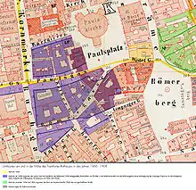Construction of the new road began from the west. Many houses in the old town fell victim to this project, including historically significant buildings such as the Nürnberger Hof and the Rebstock Hof on the market square. In Buchgasse, the houses Zum Goldstein and the Baseler Hof were also demolished. Cross streets like Schöppen-, Pauls-, Römer- or Kälbergasse even disappeared completely from the Frankfurt city map. The new street, named Bethmannstraße, roughly followed the course of the previous Schöppengasse and Paulsgasse. Along Bethmannstraße, the imposing buildings of the new city hall were built between 1900 and 1908, designed by architects Franz von Hoven and Ludwig Neher. These buildings, located on the east side of Kornmarkt and Buchgasse, were crowned by the two city hall towers Langer Franz and Kleiner Kohn on Buchgasse.[10]