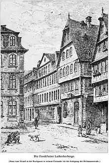 In the Middle Ages, the southern part of Kornmarkt was primarily occupied by armorers and blacksmiths. However, towards the end of the 15th century, the area underwent a significant transformation as printers and booksellers started to settle here, displacing the previously resident crafts. This influx of new inhabitants led to the southern part of Kornmarkt being renamed Buchgasse. The merchants held a book fair here twice a year from 1480.[2] Over time, the Frankfurt Book Fair became the most important book fair in Europe. Due to the liberal regulations of the Free Imperial City, even the writings of Martin Luther could be traded here at the beginning of the Reformation, which was banned elsewhere because of heresy.[3] At the 1520 fair, a Frankfurt bookseller sold over 1400 copies of his writings. Luther himself stayed at the Gasthof Zum Strauß on his journey to the Diet of Worms on Sunday, April 14, 1521, and on his return on Saturday, April 27, 1521.[4][5] The Gasthof zum Strauß was located at the corner of Schüppengasse and Buchgasse; it was demolished in 1896 when Bethmannstrasse was built.