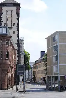 Beyond the crossing begins Buchgasse. On the western side of the street stands the preserved main building of the Bethmann Bank, while on the eastern side is the new city hall, featuring incompletely rebuilt city hall towers Langer Franz and Kleiner Cohn after war damage.