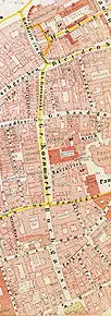 Following the construction of the Staufenmauer, the city expanded northward, doubling its walled area. Previously, the main streets predominantly ran in an east-west direction, including Alte Mainzer Gasse, Saalgasse, and Markt. With the expansion, three new main streets were introduced, connecting the newly developed parts of the city with the existing ones. These main streets served the purpose of facilitating traffic between the two new inland city gates and the existing gates leading to the harbor on the banks of the Main River:[1]