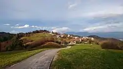 The local church on a hill above the settlement is dedicated to the Holy Cross and was built around 1500. It contains many well-preserved frescos from 1502 that depict the legends of Saint Ulrich, to whom the church was dedicated until 1867, and of Saint Corbinian. Some of the frescos in the nave, dating to around 1530,[5] are believed to be by Jernej of Loka. The hill with the church is a popular destination for short outings by locals.[6]