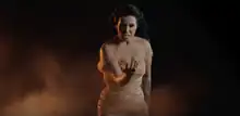 A screenshot of the "dark" and "dramatic" music video, showcasing Jonida Maliqi in front of a black backdrop with white smoke slowly moving across her.[10]