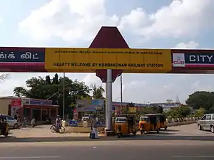 Kumbakonam railway station is a railway station serving the city of Kumbakonam in Tamil Nadu, India. The station is a part of the Tiruchirappalli railway division of the Southern Railway Zone and connects the city to various parts of the state as well as the rest of the country.The station was declared as cleanest railway station in Tamil Nadu and ranked fifth best in the national level in 2016. It is classified as an "'A' category railway station" in the Trichy railway division of the Southern Railway Zone.It is one of the busiest and top revenue generating stations of the Southern Railway zone after Tiruchirapalli TPJ, Thanjavur TJ in Tiruchirapalli division.[2] The Shradha Sethu express connected Kumbakonam to Ayodhya. The well-known Mahamaham tank is 1 km (0.62 mi) from the railway station.