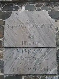 • Och konung Gustaf har lagt den sista sten år .. ("And here laid King Gustav the last stone in the year", the year is left unwritten, because Gustav III never arrived to lay the last stone)
