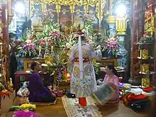 Lên đồng is commonly associated with Đạo Mẫu, Thánh Trần worship and Nội Đạo Tràng.[3] The date of lên đồng rituals are typically planned to coincide with a festival, anniversary, or the inauguration of a Mother house, although rituals may also be performed at more informal occasions. Rituals are generally held in temples, shrines or similarly sacred locations.[4] Joss paper—which may range from flowers, cakes and sweets to alcohol, cigarettes and jewelry—and, on certain occasions, even Coca-Cola cans[nb 1]—must be purchased.[2] Mediums generally also purchase a number of different costumes to be worn during the ritual. Before the main ritual takes place, mediums undergo several days of purifying rituals, involving abstention from sexual intercourse and eating meat.[2]