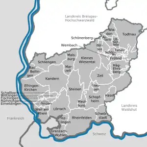 Lörrach is a Landkreis (district) in the southwest of Baden-Württemberg, Germany. Neighboring districts are Breisgau-Hochschwarzwald and Waldshut. To the west it borders the French département Haut-Rhin; to the south the Swiss cantons Basel-Stadt, Basel-Landschaft and Aargau.