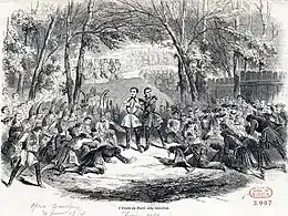 Illustration of people dancing with text that reads, "Polka Mazurka sur L'Etoile Du Nord de C. Meyerbeer pour le piano par Adrien Talexy."