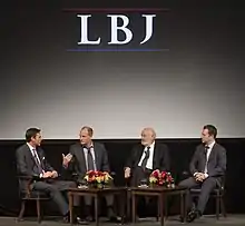 (L–R) Mark Updegrove (LBJ Library Director), Woody Harrelson, Rob Reiner and Joey Hartstone participate in a discussion following a screening of LBJ at the LBJ Presidential Library