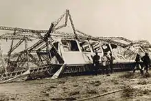 Schwaben was destroyed in a gale on June 28, 1912 at the airfield near Düsseldorf,[6][7] The wind prevented it being put into its shed, and it broke loose from its moorings and broke its back. The hydrogen was ignited by spark caused by static electricity accumulated in the rubberised cotton gasbags:[8] in moments the entire ship had been burnt. Sources differ regarding injuries suffered: the New York Times reported "34 soldiers were injured";[9] others claimed either 30[7] or 40 injured.[10]