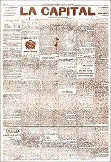 The newspaper was founded by Italian immigrant Victorio Tetamanti in 1905, its first edition being published on 25 May, on the 95th anniversary of the May Revolution. Tettamanti was a former steward at landowner Miguel Martinez de Hoz's ranch or estancia at Chapadmalal, then a rural area southwest of Mar del Plata. Tettamanti and Martinez de Hoz were both members of the Comite Mar del Plata ("Mar del Plata Comitee"), with strong links to the local upper class, and shared the same conservative ideology. The paper was instrumental to the election as Mar del Plata's mayor of Jose Heguilor, another member of the committee, in 1906. The municipality faced a series of crisis from 1906 to 1911, a period characterized by the collapse of locally-elected governments and direct rule by commissioners appointed by the province of Buenos Aires senate. In this new context, La Capital eventually gave support to the Junta de Resistencia ("Board of Resistance"), a political space that pressed for the continuity of locally-chosen authorities.[2] A democratic process followed, which ended up in 1920 with the election of socialist mayor Teodoro Bronzini. Socialism remained in power until yet another provincial intervention in 1929.[3]