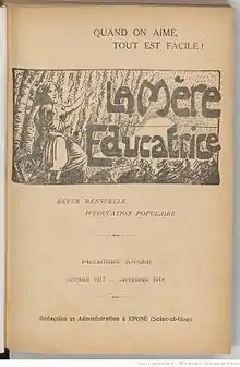 La mère éducatrice (French: Motherhood and Education) was a feminist anarchist magazine founded by Madeleine Vernet.[1] It was first published in October 1917.[2] Its headquarters was in Levallois-Perret.[3] Madeleine Vernet also edited the magazine.[4] The magazine adopted a pacifist, socialist and educative stance.[1][5] In line with this approach, it argued that the major way to end war is education.[6] It existed until 1939.[6][7]