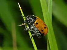These beetles are 75–10 millimetres (2.95–0.39 in) long, the head and pronotum are black, the elytra are bright yellow-orange, with six black dots.