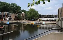 Lake Anne Center was the first village center created in the planned community, and features a mix of commercial and residential buildings around a plaza and inlet of Lake Anne, a man-made reservoir. The village center was designed by Reston's master planner and architect James Rossant of New York City for Robert E. Simon and built 1963–67. At the time it was considered a showcase of modern community planning; architecturally, it is composed mainly of modestly scaled Brutalist structures, including residential townhouses, mixed commercial-residential buildings, and a church.[2]