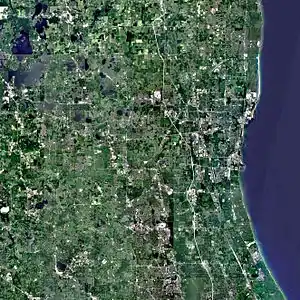 Lake County is situated in the northeastern corner of the U.S. state of Illinois, along the shores of Lake Michigan. As of the 2020 census, it has a population of 714,342,[1] making it the third-most populous county in Illinois. Its county seat is Waukegan, the tenth-largest city in Illinois.[2] The county is primarily suburban, with some urban areas and some rural areas. Due to its location, immediately north of Cook County, Lake County is one of the collar counties of the Chicago metropolitan area. Its northern boundary is the Wisconsin state line.