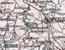 After the conquest of most of Silesia, King Frederick the Great introduced Prussian administrative structures in Lower Silesia in 1742 and in Upper Silesia in 1743.[1] This included the establishment of two war and domain chambers in Breslau and Glogau as well as their division into districts. The district of Falkenberg was initially under the War and Domain Chamber of Breslau. In the course of the Prussian Reform Movement, the administrative region of Oppeln was created in the Province of Silesia, which included the Falkenberg district.
