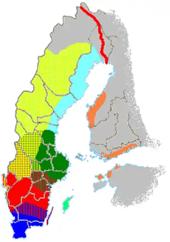 Map showing the Swedish dialects traditionally spoken. Stripes indicate transitional areas.