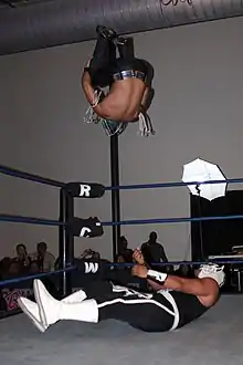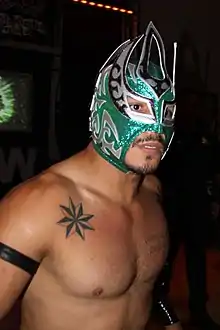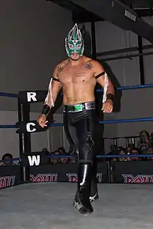 Laredo Kid was one of the participants in the original Alas de Oro (Spanish for "Wings of Gold"), but was eliminated by eventual winner Extreme Tiger.[11] At Triplemanía XV Laredo Kid and Gran Apache defeated Super Fly and Super Caló in a Relevos Suicidas tag team match. Losing the match forced Super Fly to wrestle Super Calo in a Lucha de Apuesta, mask vs. mask match.[12] In August 2008 Laredo Kid, along with El Oriental, Histeria and Antifaz traveled to Japan to compete on Pro Wrestling Noah's 2007 "Shiny Navigation" tour that ran over ten events from August 19, 2007 until September 2, 2009. On most nights Laredo Kid teamed with El Oriental against Histeria and Antifaz, sometimes in six-man matches teaming with Ricky Marvin while Histeria and Antifaz teamed with Rocky Romero.[13][14][15][16][17][18][19][20][21][22] On September 3, 2009 on the last night in Japan Laredo Kid teamed with Super Fly to defeat Atsushi Aoki and Ippei Ota on a joint AAA/NOAH show called TripleSEM.[23] Two weeks later Latin Lover, La Parka and Ricky Marvin to defeat the La Legión Extranjera team of Abismo Negro, Ron Killings, Kenzo Suzuki and X-Pac in one of the feature matches on the 2007 Verano de Escandalo event. Laredo Kid got the winning pinfall on X-Pac, Laredo Kid's biggest win to date.[24]