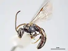These bees are around 5 mm long, with relatively large wings for their body size. Most of the body is covered with hair. Their appearance is described as fly-like,[1] and small and agile.[2] They have short tongues, but this does not restrict their ability to gather pollen.[3] Females have wider abdomens than the males. They appear very similar in colour and shape to a honey bee, however, the small native bee is not as stout. Lasioglossum sordidum often get mistaken for flies or go completely unnoticed as they look like small flies.[4]
